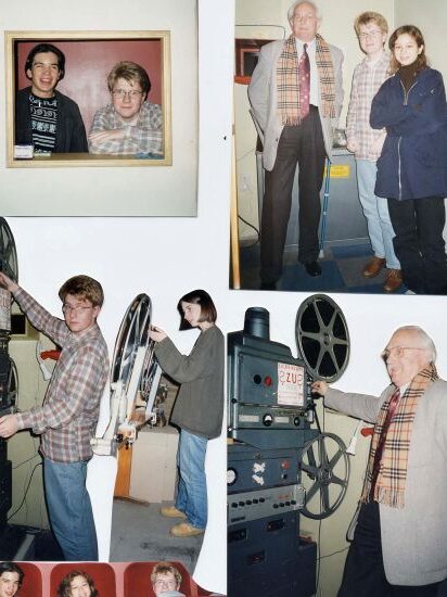 After watching the films, the students discussed the movies with each other in the next room. Sometimes it got very late. After Pfützner retired, his colleague Eva Kühn took over the discussion group. After she left, Klub 67 came to an end. Difficult times came for FilmClub Leibniz in the 1990s. Labenski worked at ZDF in the feature film editorial department and commuted between Wiesbaden and Berlin. He also had health problems. We owe him not only the short features "Apropos Film", but also the Monday evening series "Der Phantastische Film" and the restoration of numerous old and sometimes almost lost films such as "Über den Dächern von Nizza", which he enthusiastically showed us in an intimate setting as soon as they were finished. In 1998, he built a second cinema room in the basement, and pupils painted the walls with scenes from famous films.
