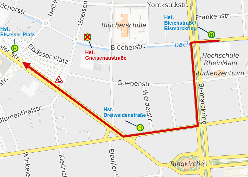 Betroffene Linien sind: 14, X76, 275, N4 und Schulbusse. In Richtung Klarenthal fahren die Busse ab der Haltestelle „Bismarckring” in der Bleichstraße links in den Bismarckring, dann rechts in die Dotzheimer Straße zur Haltestelle „Dreiweidenstraße”. Anschließend geht es rechts in die Klarenthaler Straße zur Haltestelle „Elsässer Platz”, von wo aus der reguläre Fahrtweg fortgesetzt wird. Die Haltestelle „Gneisenaustraße” kann im genannten Zeitraum nicht angefahren werden.