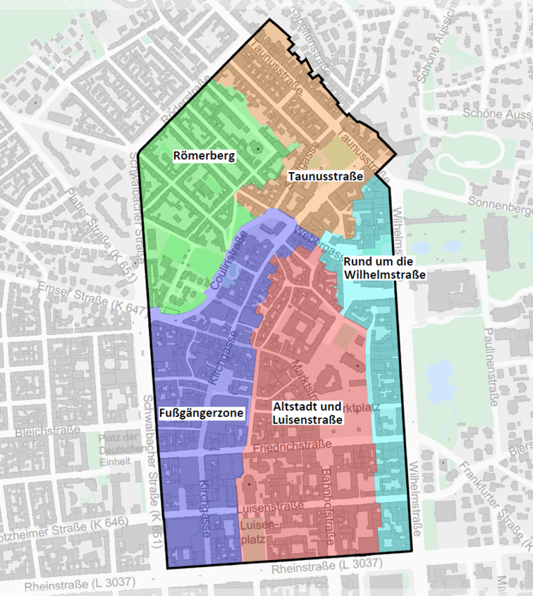 Die Rue, das Kurhaus, das Theater, beratungsintensiver Einzelhandel im gehobenen Segment sowie touristische und künstlerische Bereiche, aber auch vier in Teilen mindergenutzte Passagen mit Durchgängen und Verbindungen.