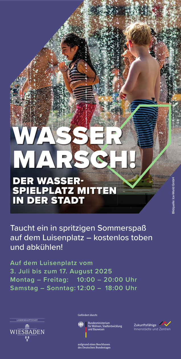 Die PlayFountain bringt Leben, Erfrischung und ein Angebot für alle Generationen in die Wiesbadener Innenstadt. Zugleich ist der mobile Wasserspielplatz auch ein Beitrag zur Klimaanpassung und fördert die Aufenthaltsqualität in der Stadt. Gerade angesichts immer heißerer Sommer ist das wichtiger denn je.
